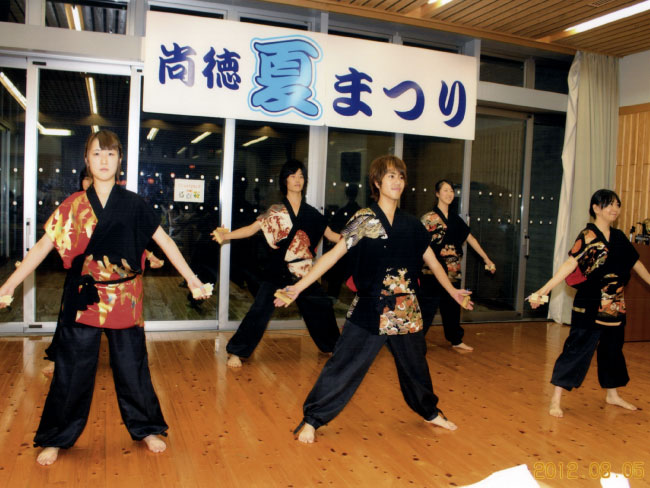 尚徳学区では、下京中学校の地下スペースにて、「尚徳夏まつり」を開催しています。焼きそばなどの露店、手品やフラダンスなどのイベント、豪華賞品のお楽しみ抽選会などで大人から子供まで楽しめるよう工夫しています。